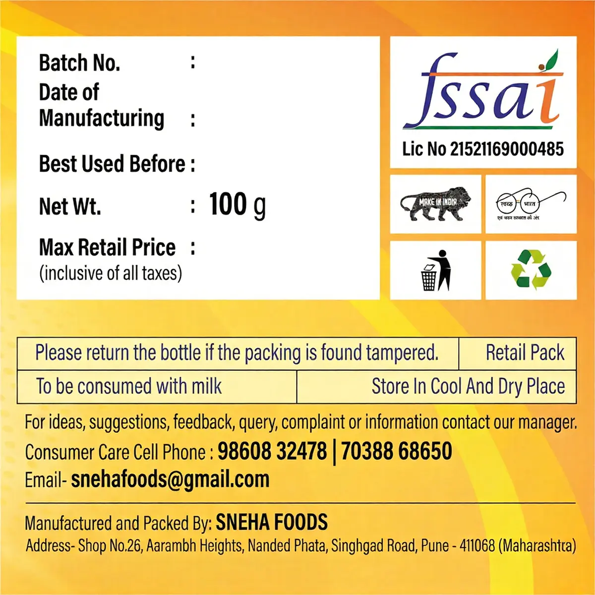 Manufactured & Packed By: Sneha Foods